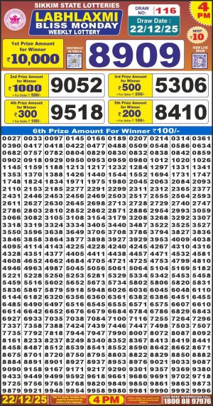 Sikkim State Lottery Sambad Dear Evening 6 PM Result Today 22-12-2025