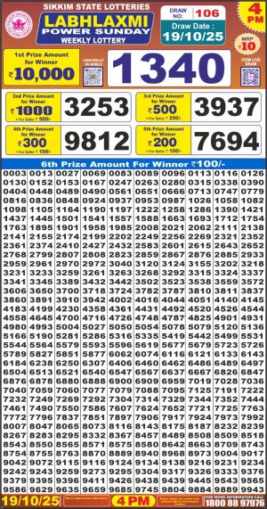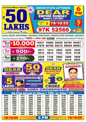 Sikkim State Lottery Sambad Dear Evening 6 PM Result Today 19-10-2025