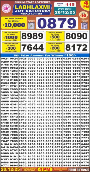 2025-12-22 Nagaland State Lottery Sambad Dear Night 8 PM Result Today 22-12-2025 Winners List 2025-12-22 Punjab State Dear 50 Lottery 6 PM Result 22-12-2025 2025-12-22 Sikkim State Lottery Sambad Dear Evening 6 PM Result Today 22-12-2025 2025-12-22 Labh Laxmi Lottery 4 PM Result Today 22-12-2025 LIVE 2025-12-22 Nagaland State Lottery Sambad Dear Morning 1 PM Result Today 22-12-2025 LIVE