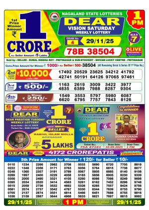 Nagaland State Lottery Sambad Dear Morning 1 PM Result Today 29-11-2025 LIVE