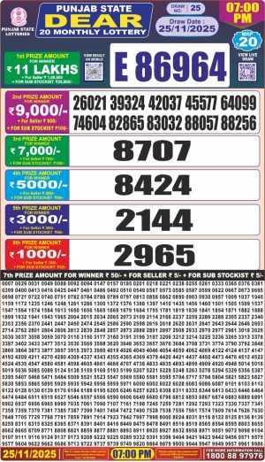 Punjab State Dear 20 Monthly Lottery 7pm Result 25-11-2025