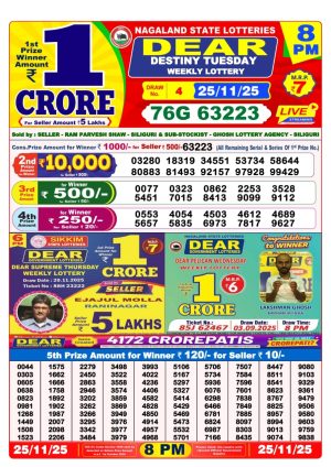 Nagaland State Lottery Sambad Dear Night 8 PM Result Today 25-11-2025 Winners List