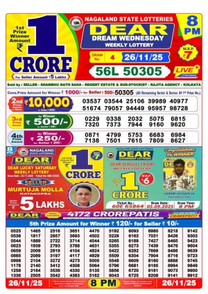 Nagaland State Lottery Sambad Dear Night 8 PM Result Today 26-11-2025 Winners List