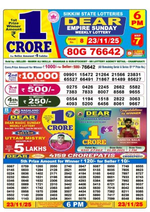 Sikkim State Lottery Sambad Dear Evening 6 PM Result Today 23-11-2025