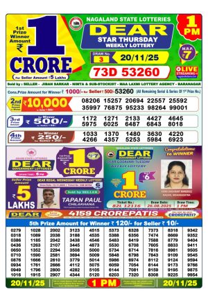Nagaland State Lottery Sambad Dear Morning 1 PM Result Today 20-11-2025 LIVE
