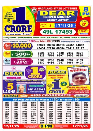 Nagaland State Lottery Sambad Dear Night 8 PM Result Today 17-11-2025 Winners List