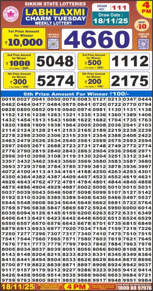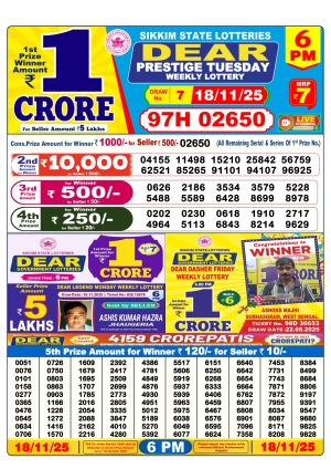 Sikkim State Lottery Sambad Dear Evening 6 PM Result Today 18-11-2025