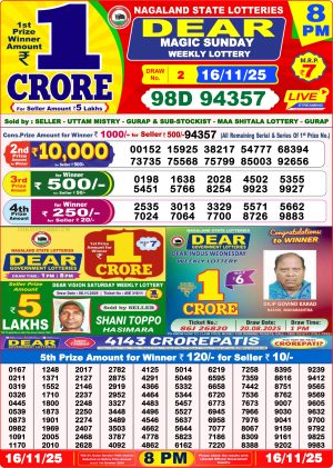 Nagaland State Lottery Sambad Dear Night 8 PM Result Today 16-11-2025 Winners List