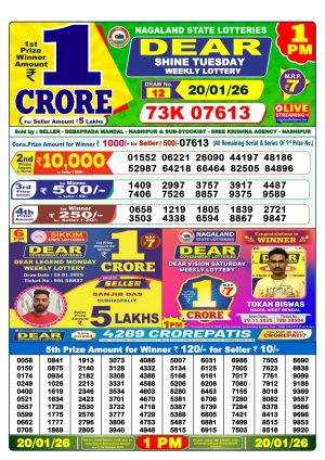 Nagaland State Lottery Sambad Dear Morning 1 PM Result Today 20-01-2026 LIVE