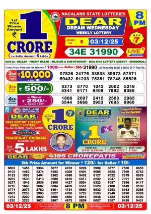 Nagaland State Lottery Sambad Dear Night 8 PM Result Today 03-12-2025 Winners List