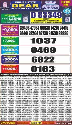 Punjab state dear 20 Monthly lottery Result 27-01-2026 Winners List