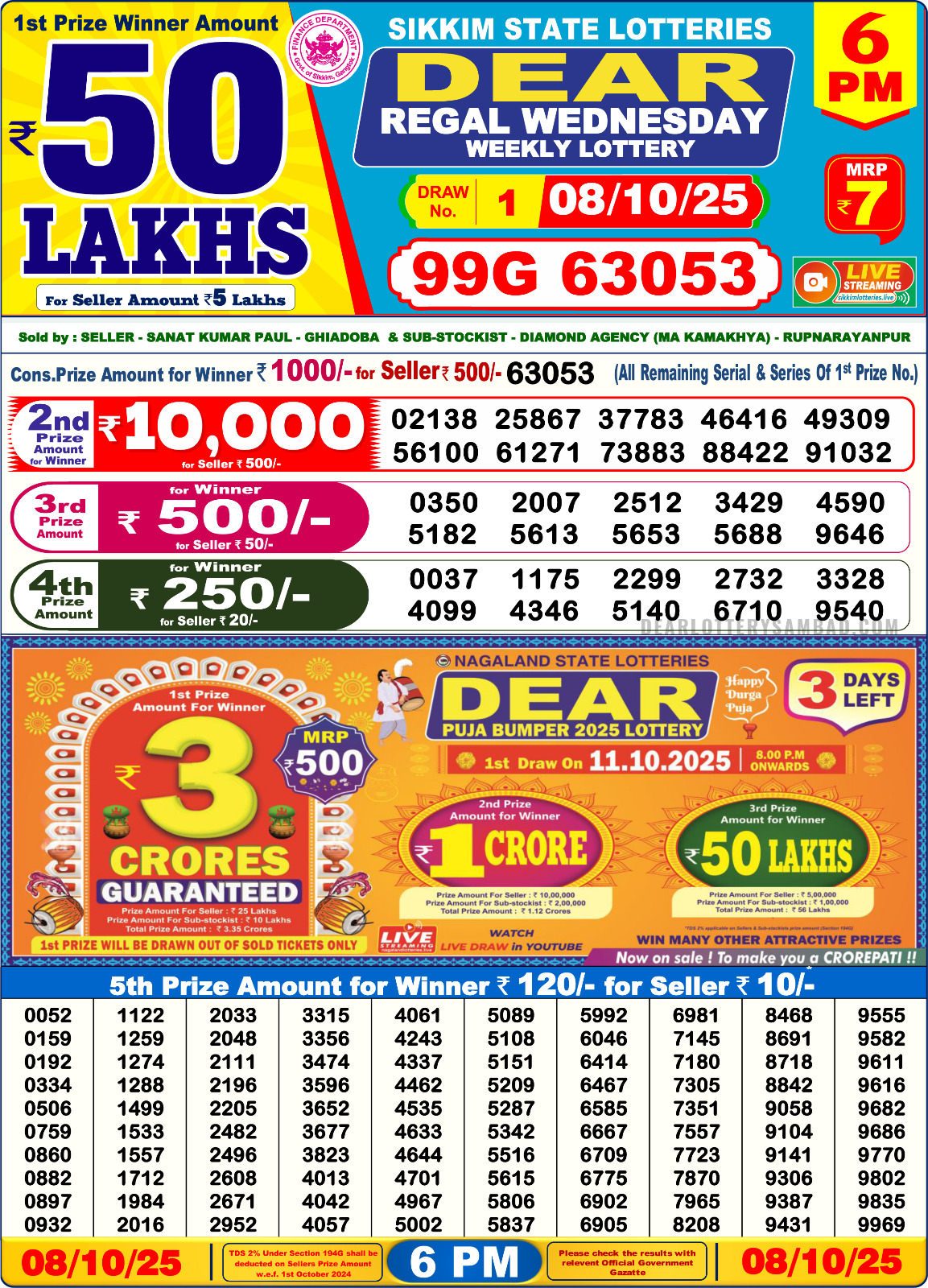 Sikkim State Lottery Sambad Dear Evening 6 PM Result Today 08-10-2025 October 8, 2025 Leave a Comment on Sikkim State Lottery Sambad Dear Evening 6 PM Result Today 08-10-2025