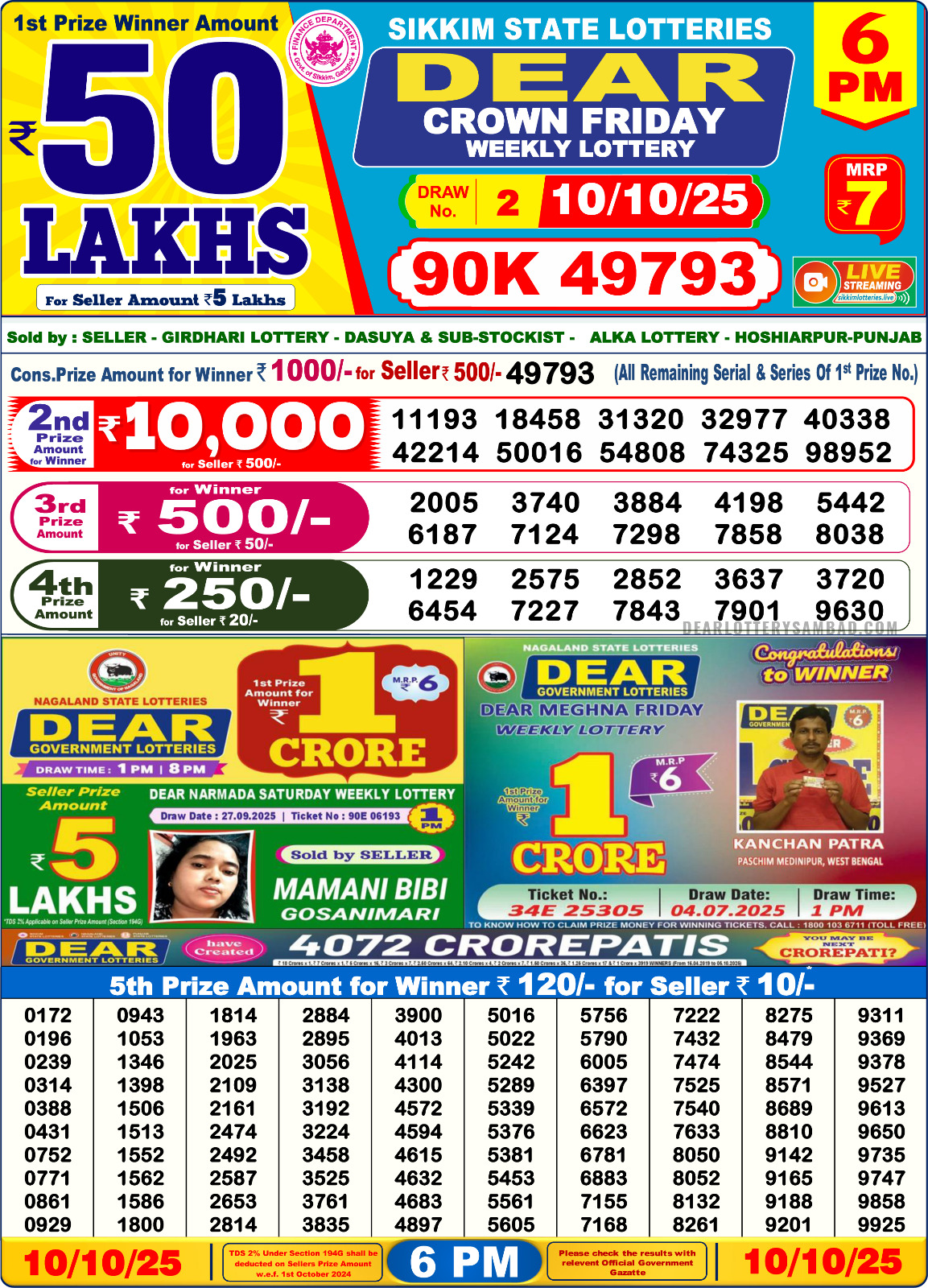 Sikkim State Lottery Sambad Dear Evening 6 PM Result Today 10-10-2025 October 10, 2025 Leave a Comment on Sikkim State Lottery Sambad Dear Evening 6 PM Result Today 10-10-2025