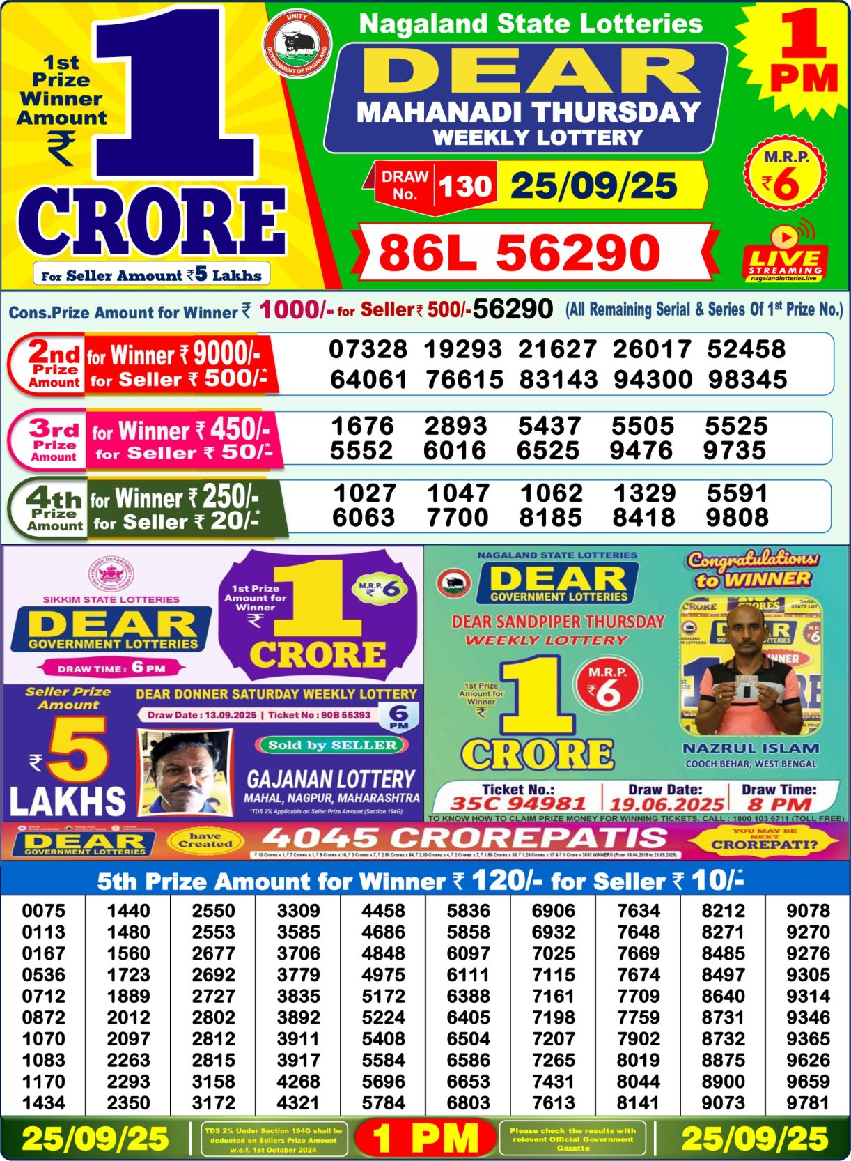 Nagaland State Lottery Sambad Dear Morning 1 PM Result Today 25-09-2025 LIVE September 25, 2025 Leave a Comment on Nagaland State Lottery Sambad Dear Morning 1 PM Result Today 25-09-2025 LIVE