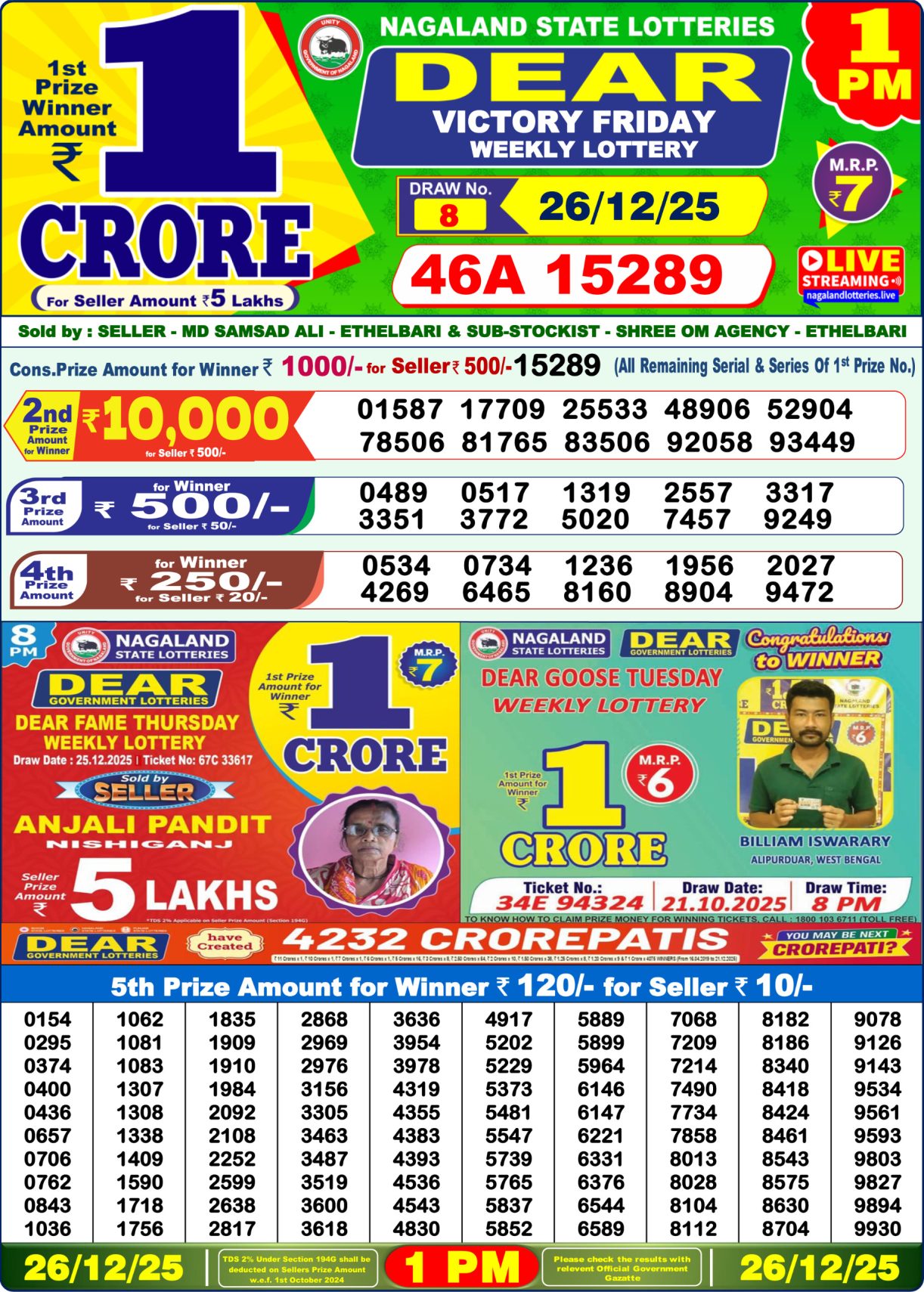 Nagaland State Lottery Sambad Dear Morning 1 PM Result Today 26-12-2025 LIVE December 26, 2025 Leave a Comment on Nagaland State Lottery Sambad Dear Morning 1 PM Result Today 26-12-2025 LIVE