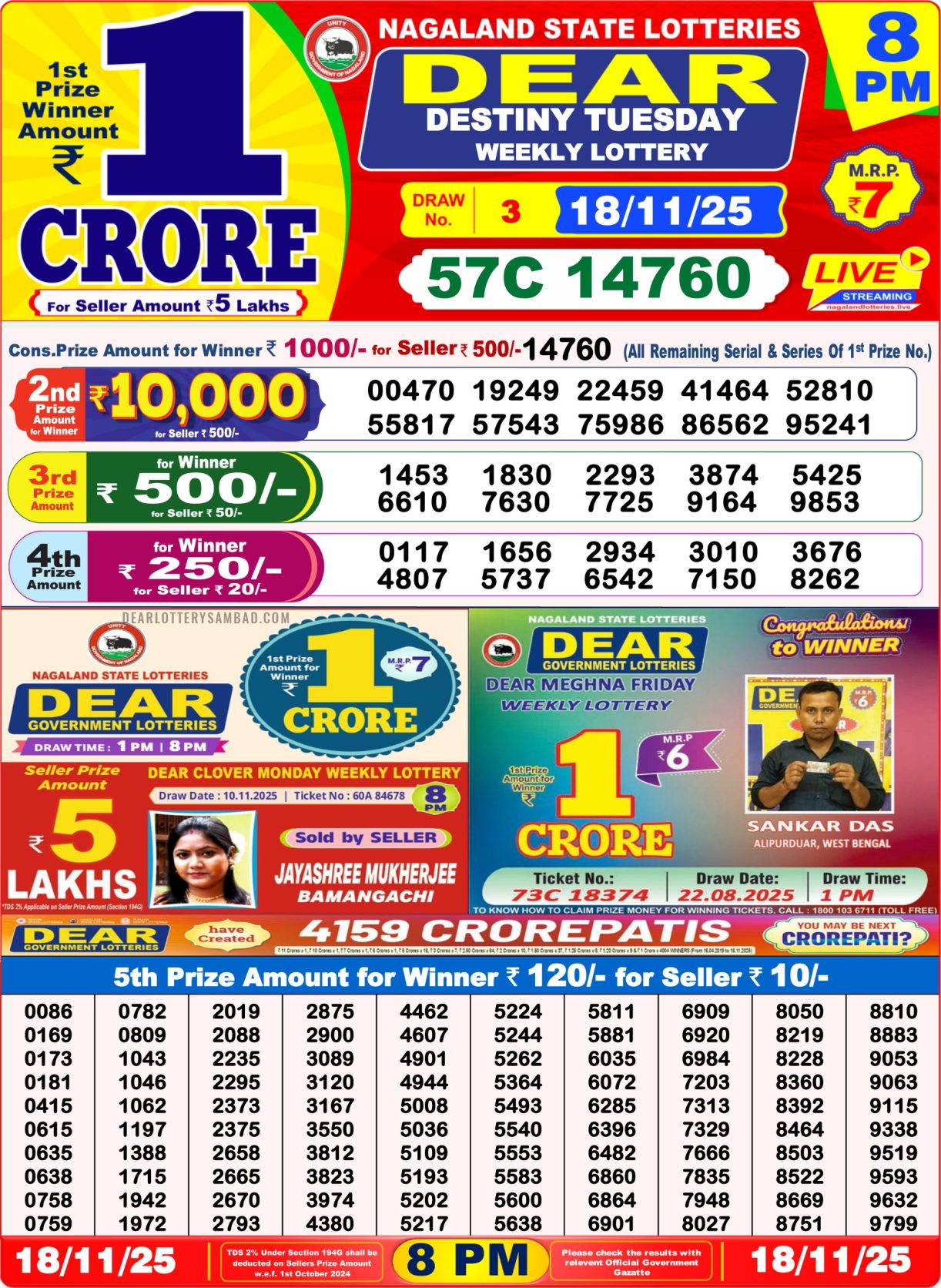 Nagaland State Lottery Sambad Dear Night 8 PM Result Today 18-11-2025 Winners List November 18, 2025 Leave a Comment on Nagaland State Lottery Sambad Dear Night 8 PM Result Today 18-11-2025 Winners List