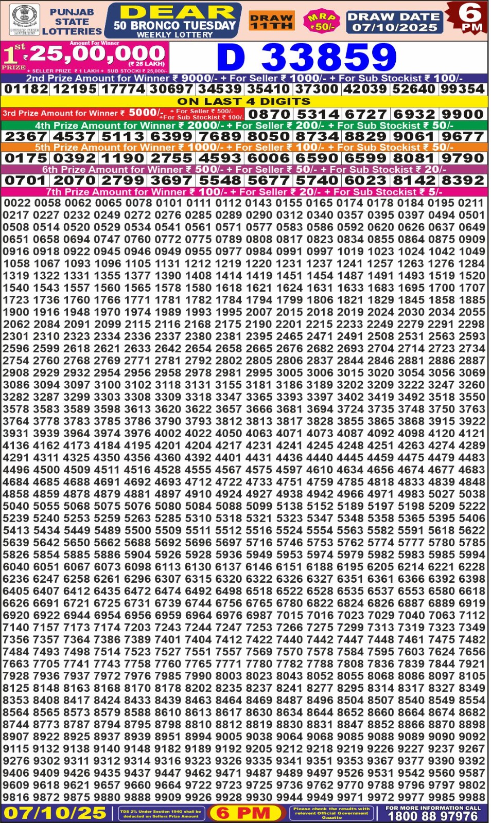 Punjab State Dear 50 Lottery 6 PM Result 07-10-2025 October 7, 2025 Leave a Comment on Punjab State Dear 50 Lottery 6 PM Result 07-10-2025