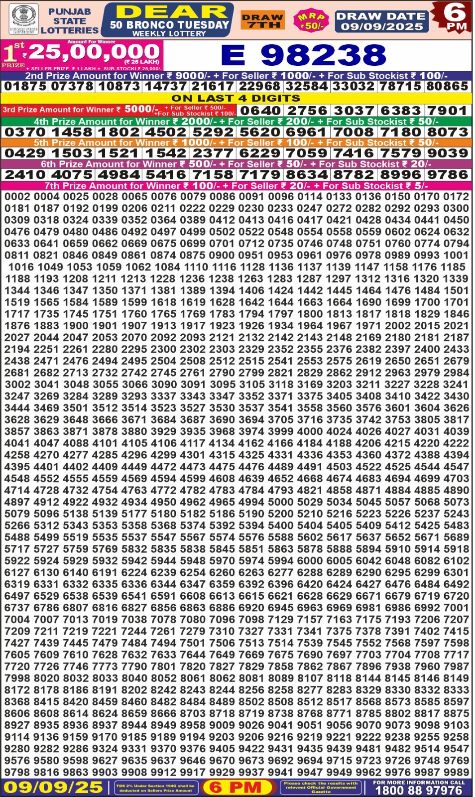 Punjab State Dear 50 Lottery 6 PM Result 09-09-2025 September 9, 2025 Leave a Comment on Punjab State Dear 50 Lottery 6 PM Result 09-09-2025