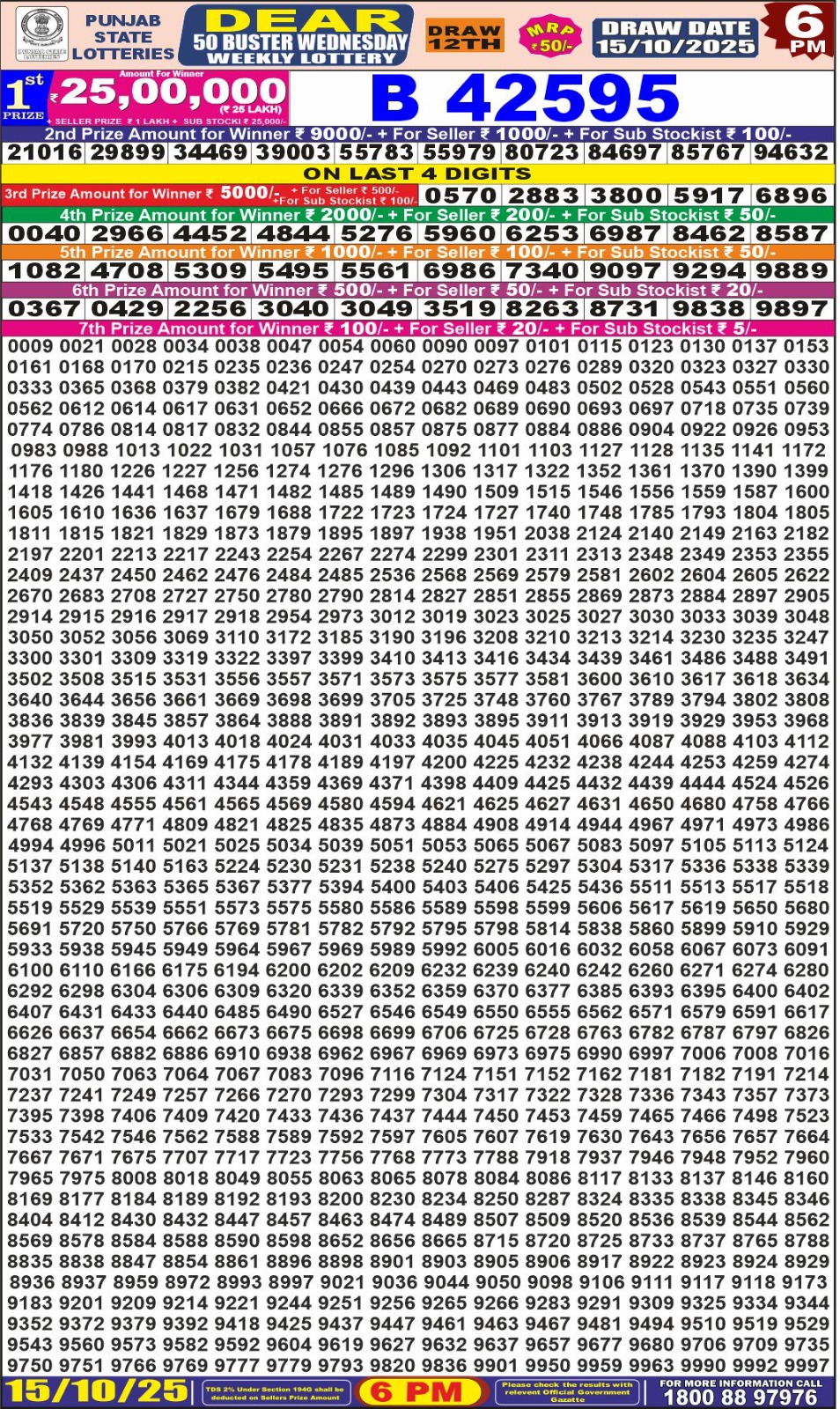 Punjab State Dear 50 Lottery 6 PM Result 15-10-2025 October 15, 2025 Leave a Comment on Punjab State Dear 50 Lottery 6 PM Result 15-10-2025