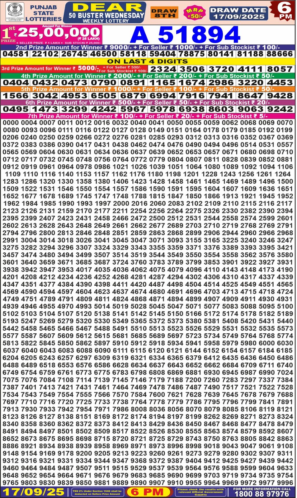 Punjab State Dear 50 Lottery 6 PM Result 17-09-2025 September 17, 2025 Leave a Comment on Punjab State Dear 50 Lottery 6 PM Result 17-09-2025