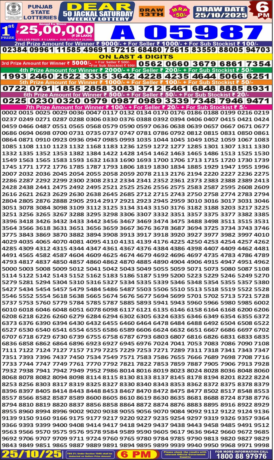 Punjab State Dear 50 Lottery 6 PM Result 25-10-2025 October 25, 2025 Leave a Comment on Punjab State Dear 50 Lottery 6 PM Result 25-10-2025