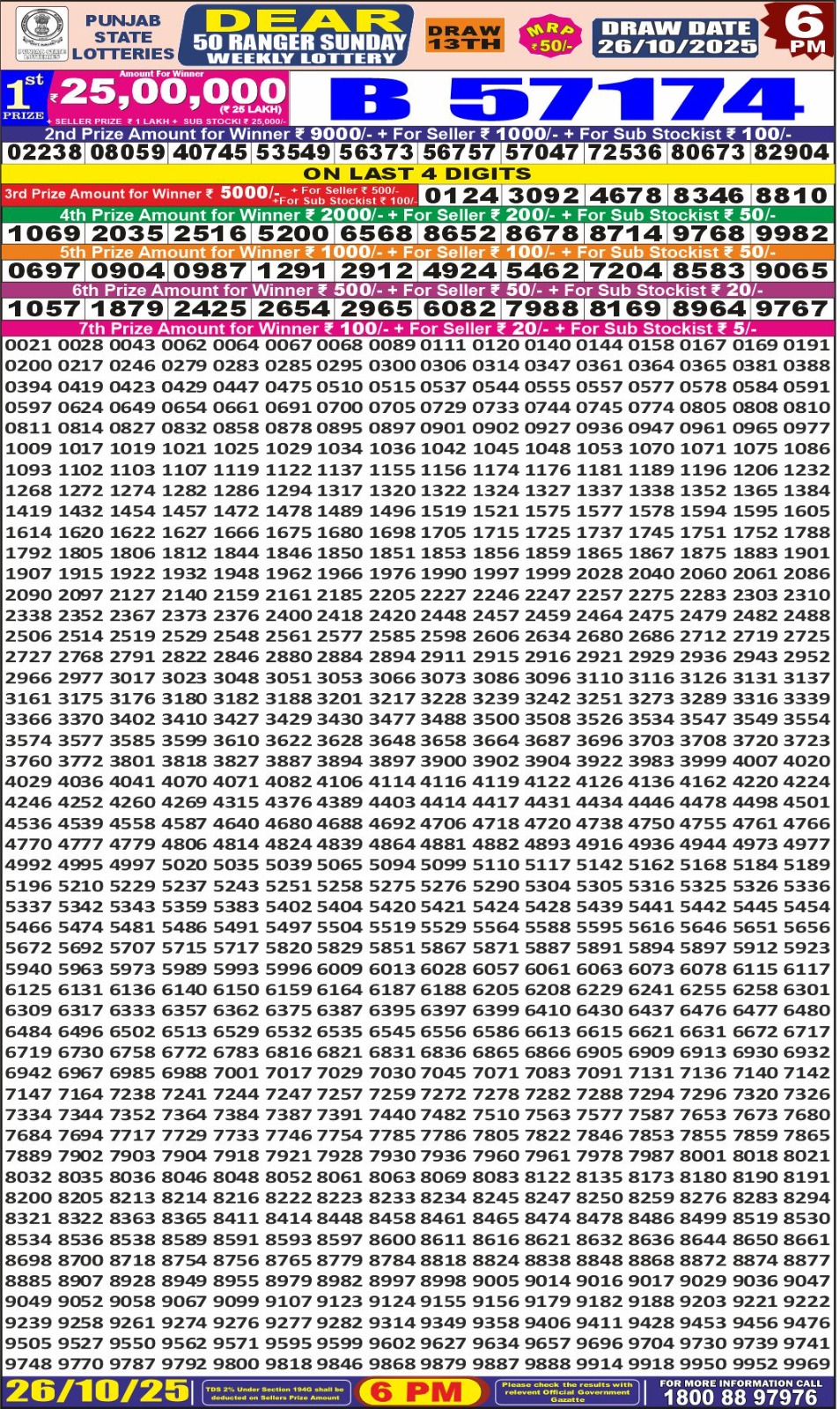 Punjab State Dear 50 Lottery 6 PM Result 26-10-2025 October 26, 2025 Leave a Comment on Punjab State Dear 50 Lottery 6 PM Result 26-10-2025